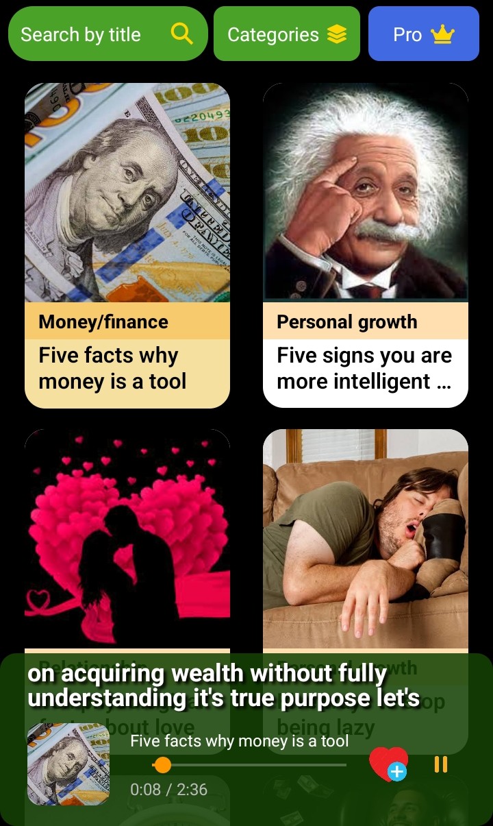 Uplify is a revolutionary platform designed to empower individuals by delivering high-quality audio content focused on health, money and finance, relationships, and personal growth. Whether you’re driving to work, hitting the gym, or simply unwinding at home, Uplify allows you to integrate self-improvement seamlessly into your routine. With Uplify, personal development becomes an effortless, enjoyable, and inspiring journey.